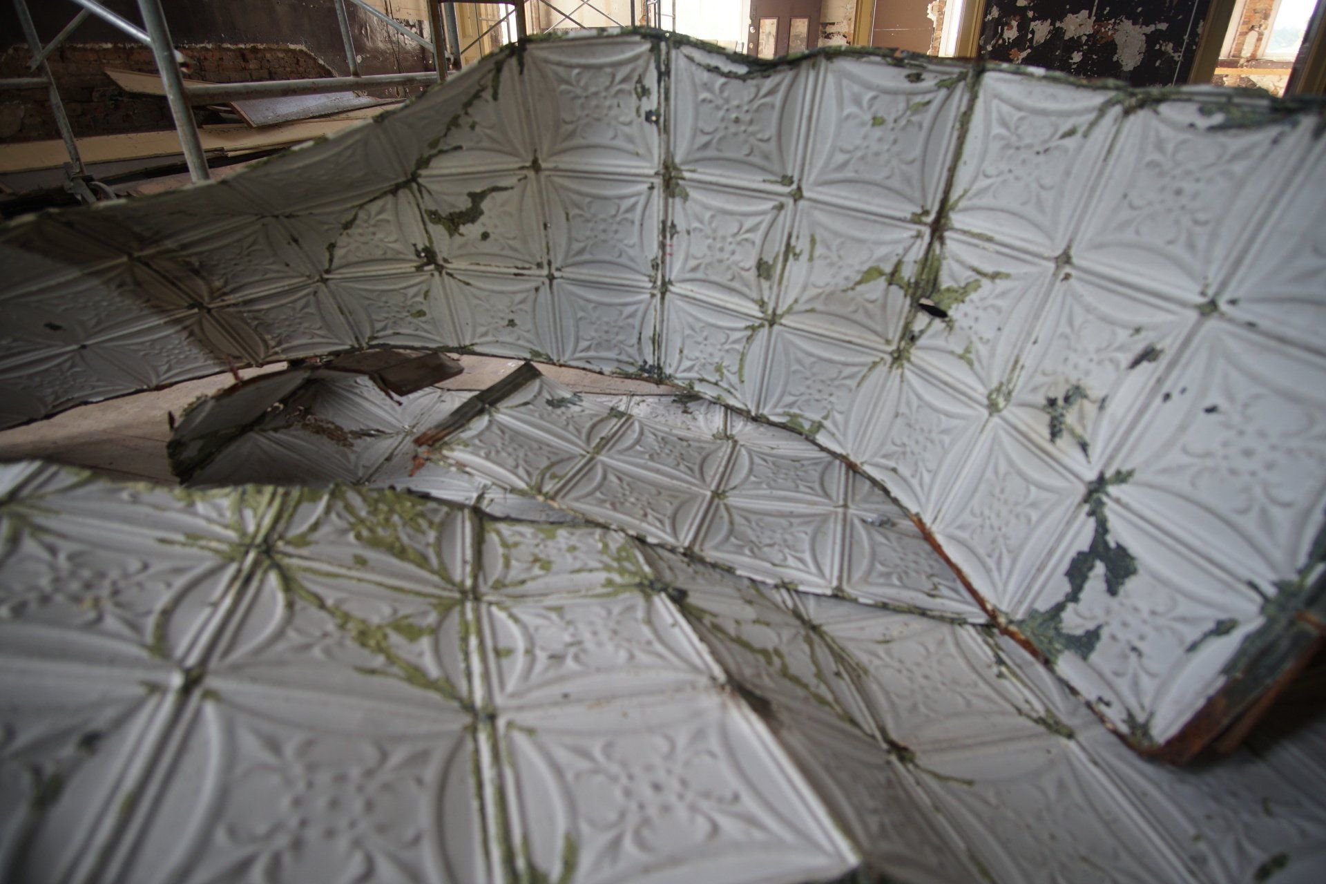 All metal ceiling panels, molding and trim had to be custom stamped to achieve the profiles required to match the existing. The most challenging of the pieces was the 30” radius cove that would be installed around the perimeter of the ceiling. It took nearly 3 trials of fabrication to get the pieces correct. Not only was the fabrication challenging, but the installation as well, requiring carpenters to perform precision framing in order for the new pieces to fit within the inconsistencies of the existing ceiling framing.
